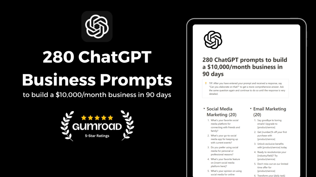 - Are the 280 ChatGPT Business Prompts easy to use? Yes, the 280 ChatGPT prompts to build a $10,000/month business in 90 days are easy to use. You’ll be able to get everything up and running within minutes of you purchasing, regardless of your prior experience with ChatGPT and Notion. Every aspect of the prompts is made exactly for every business's needs.
