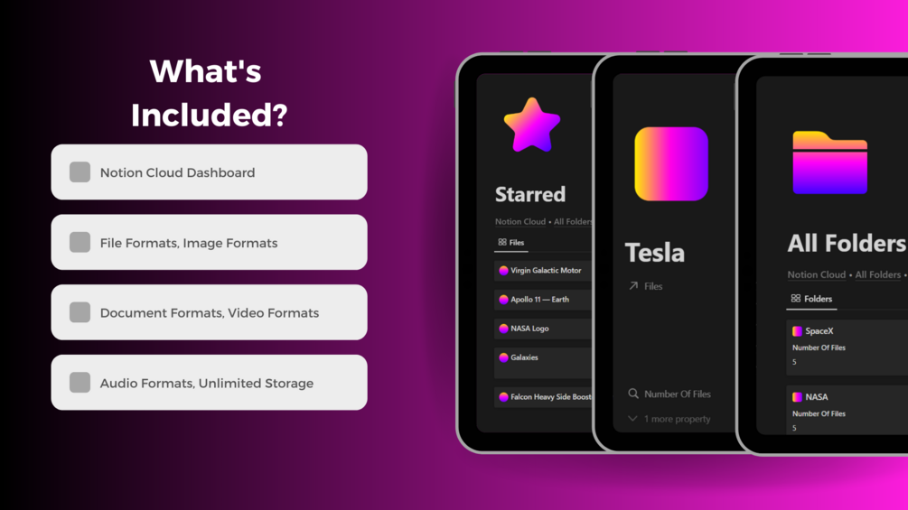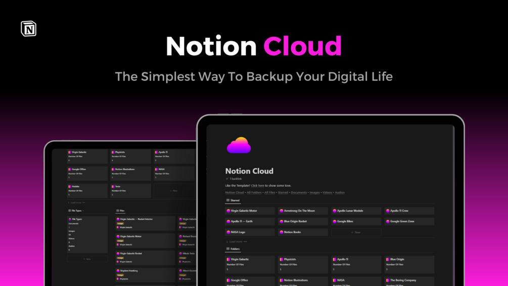 - Notion Cloud Dashboard: All Files, All Folders, File Types, Starred, Documents, Images, Videos, Audios (get easy and secure access to your files)