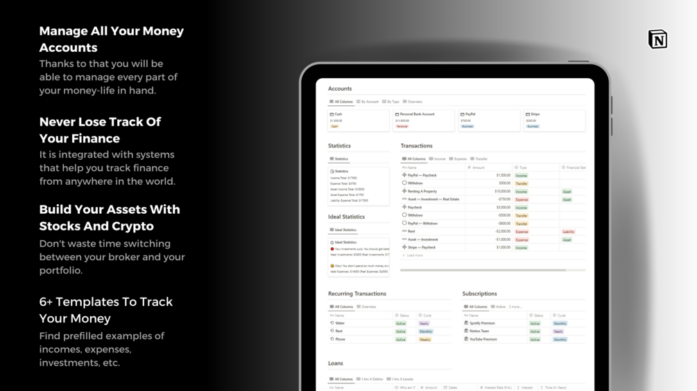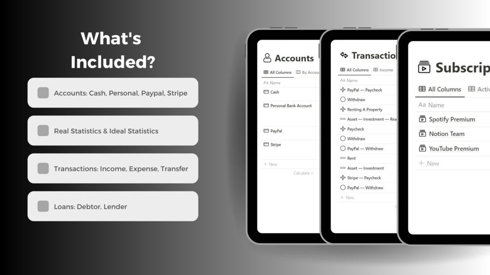 You will also get databases that are connected to each other which will allow you to create an all-in-one finance system to capture and organize your money, income, expenses, investments, and more. Track your lifetime money through: