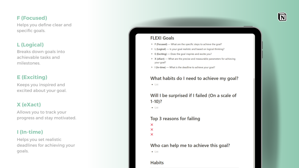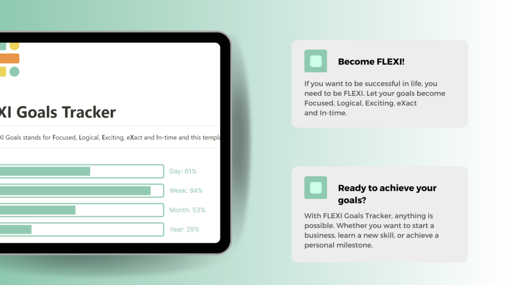 Are you tired of setting goals and not achieving them? Do you struggle with staying focused and motivated? The FLEXI Goals Tracker is here to help. With this Notion template, you can finally turn your dreams into reality.