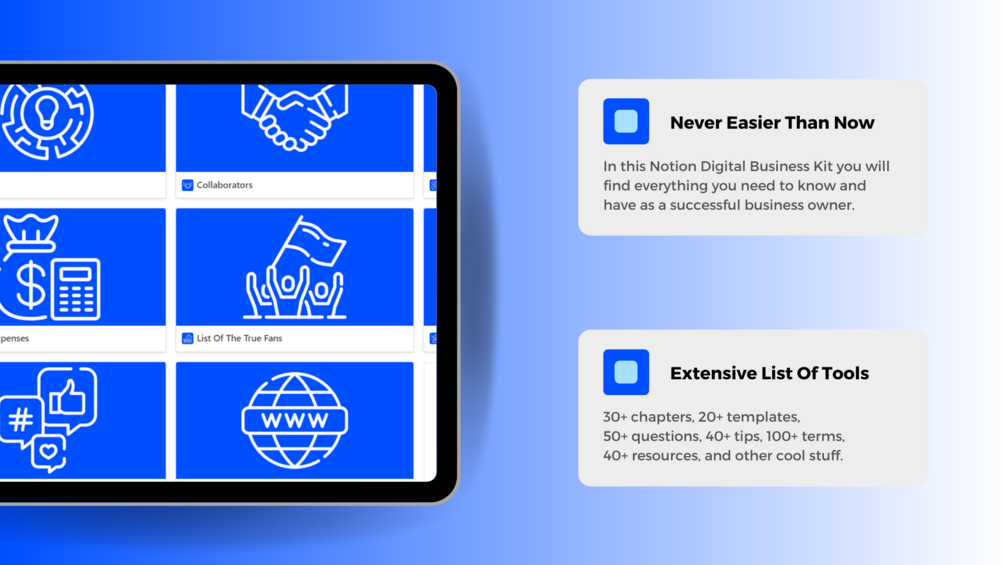Starting an online business was never easier than now. In this Notion Digital Business Kit you will find everything you need to know and have as a successful digital business owner.