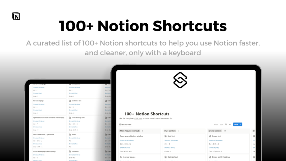 A curated list of 100+ Notion shortcuts to help you use Notion faster, and cleaner, only with a keyboard.