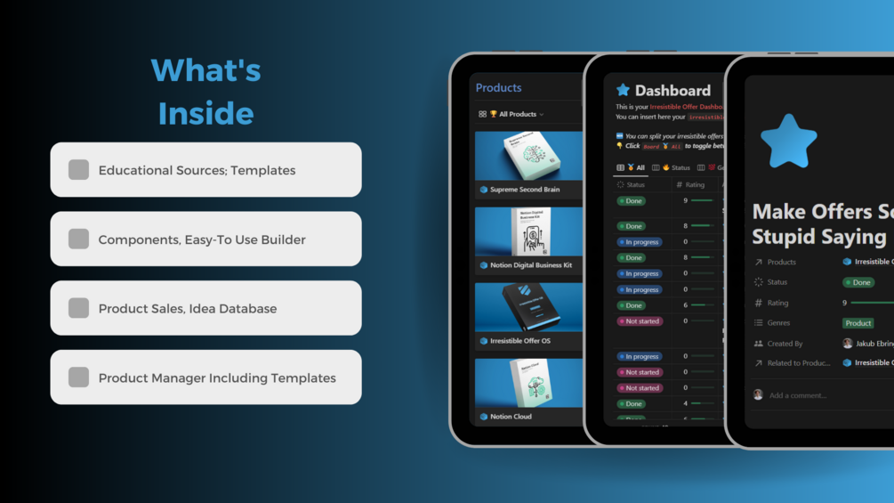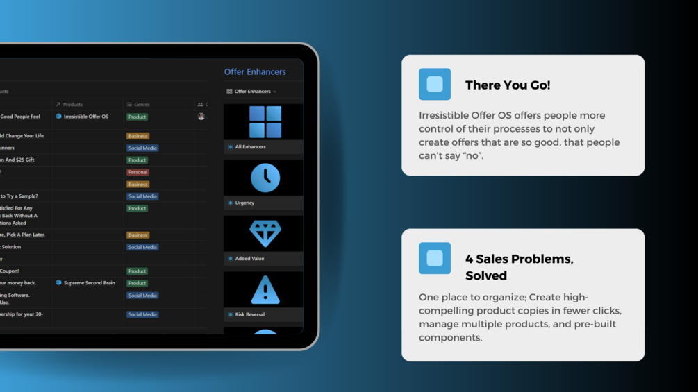 Irresistible Offer OS offers people more control of their processes to not only create offers that are so good, that people can’t say “no”, but to learn the complete process of producing irresistible offers, getting inspiration from the best ones, managing their products, generating offer enhancers and making prospects buy the products all from one digital place.