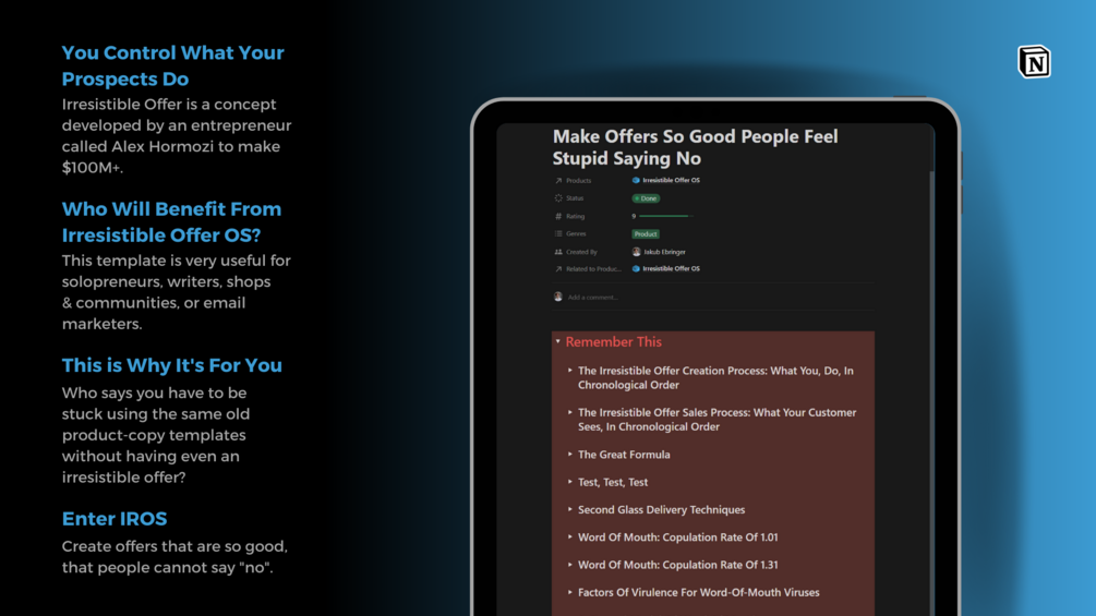 Built with Notion, Irresistible Offer OS is the first of its kind; a workspace for any type of business creating offers for their products in copies, sales emails and ad campaigns.